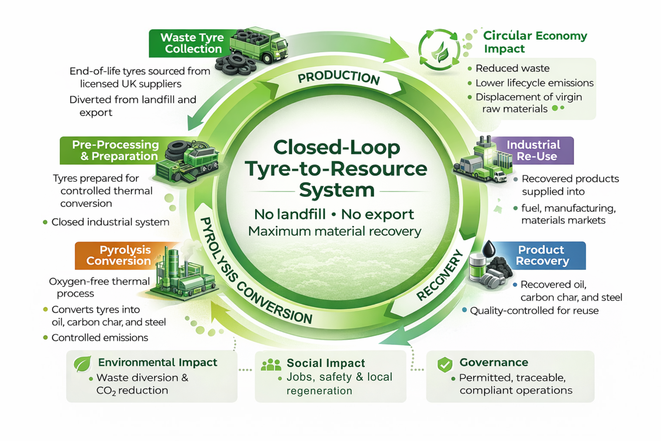 The thermochemical process is environmentally friendly and complies fully with all UK and European waste directives. The increasingly tight regulations for disposing of tyres gives us a key commercial advantage over alternative methods of tyre disposal.